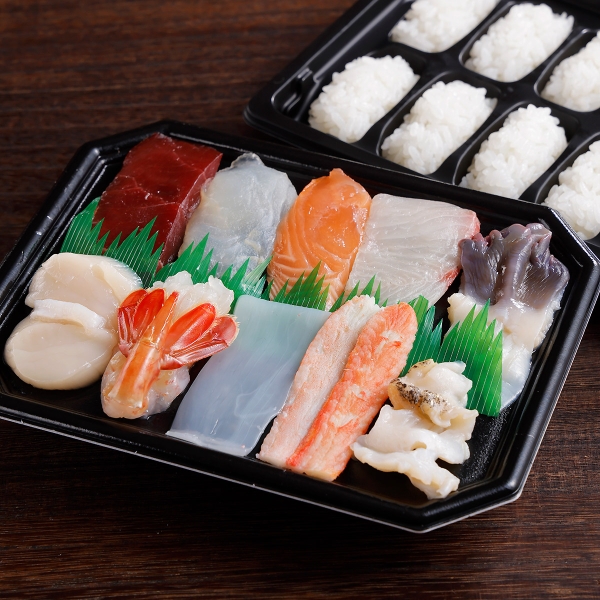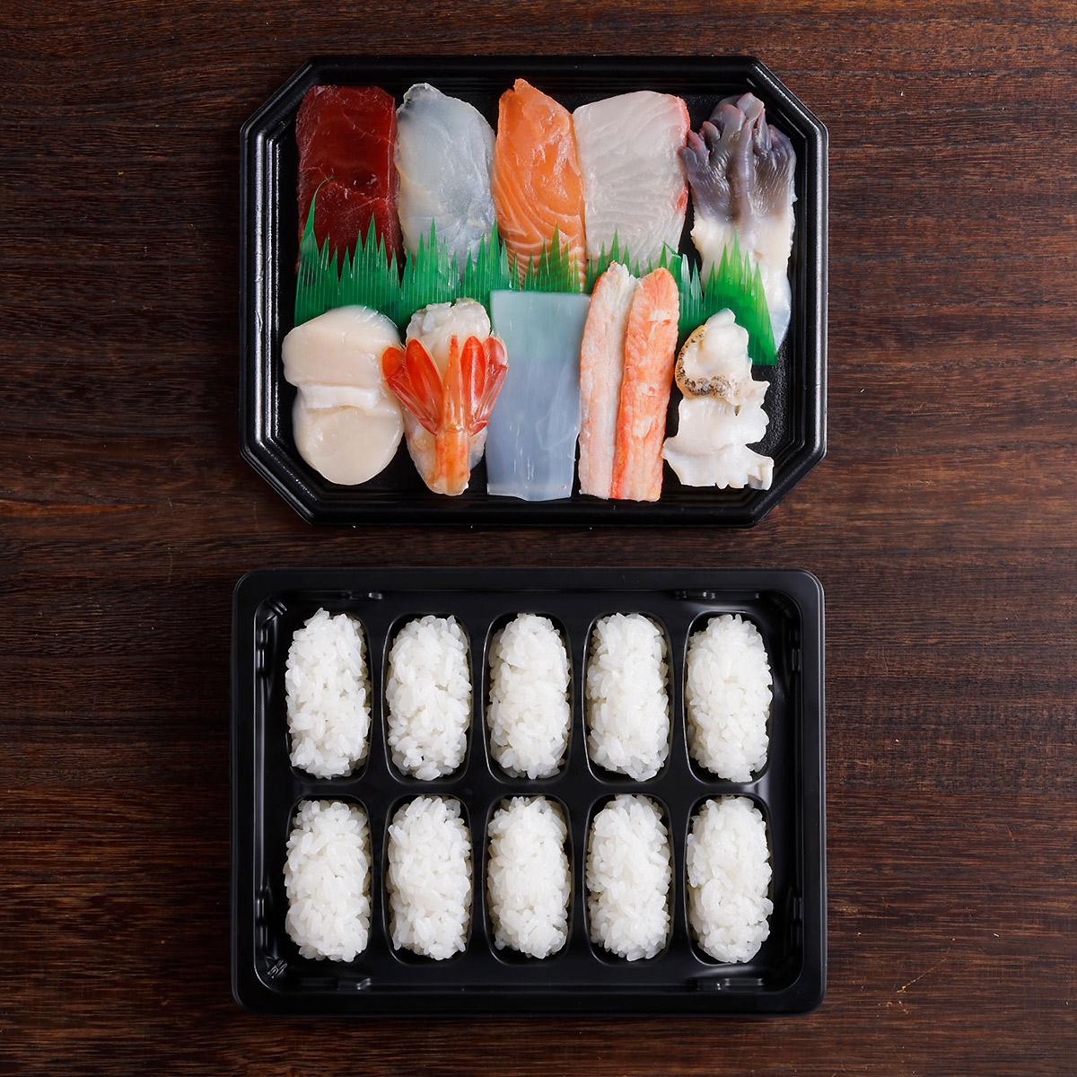 凍眠寿司種セット松 本鮪(15g)、ほたて(18g)、真いか(8g)、平目(15g)、ほっき(10g)、ぼたん海老(25g)、かんぱち(15g)、ズワイガニ(11g)、サーモン(15g)、つぶ(8g)、シャリ10貫付き(180g)