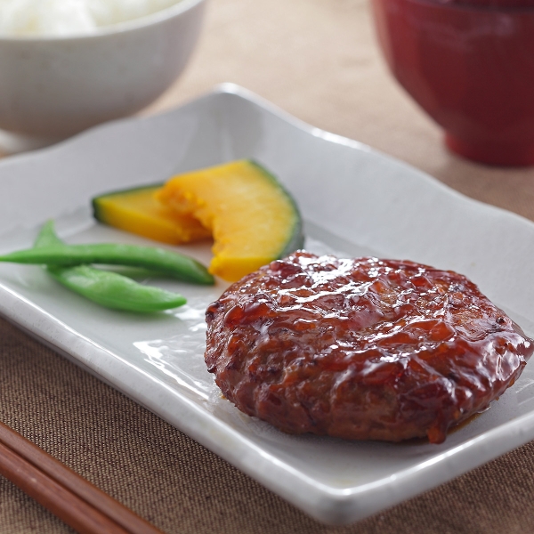 和風照り焼きソースのハンバーグ。焼き上げはスチームオーブンを使用し、余分な脂を落としヘルシーに仕上げました。お年寄りからお子様まで幅広く人気の商品です。
