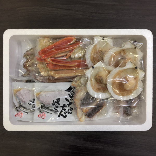 ゆでずわいがにカット300g×1、生たらばがにカット200g×1、帆立片貝75g×4、鮭のちゃんちゃん焼き80g×2、添付味噌たれ30g×2袋、ツボ抜きいか100g×2、姫鱈一夜干し50g×4、ほっけ(開き)一夜干し200g×1