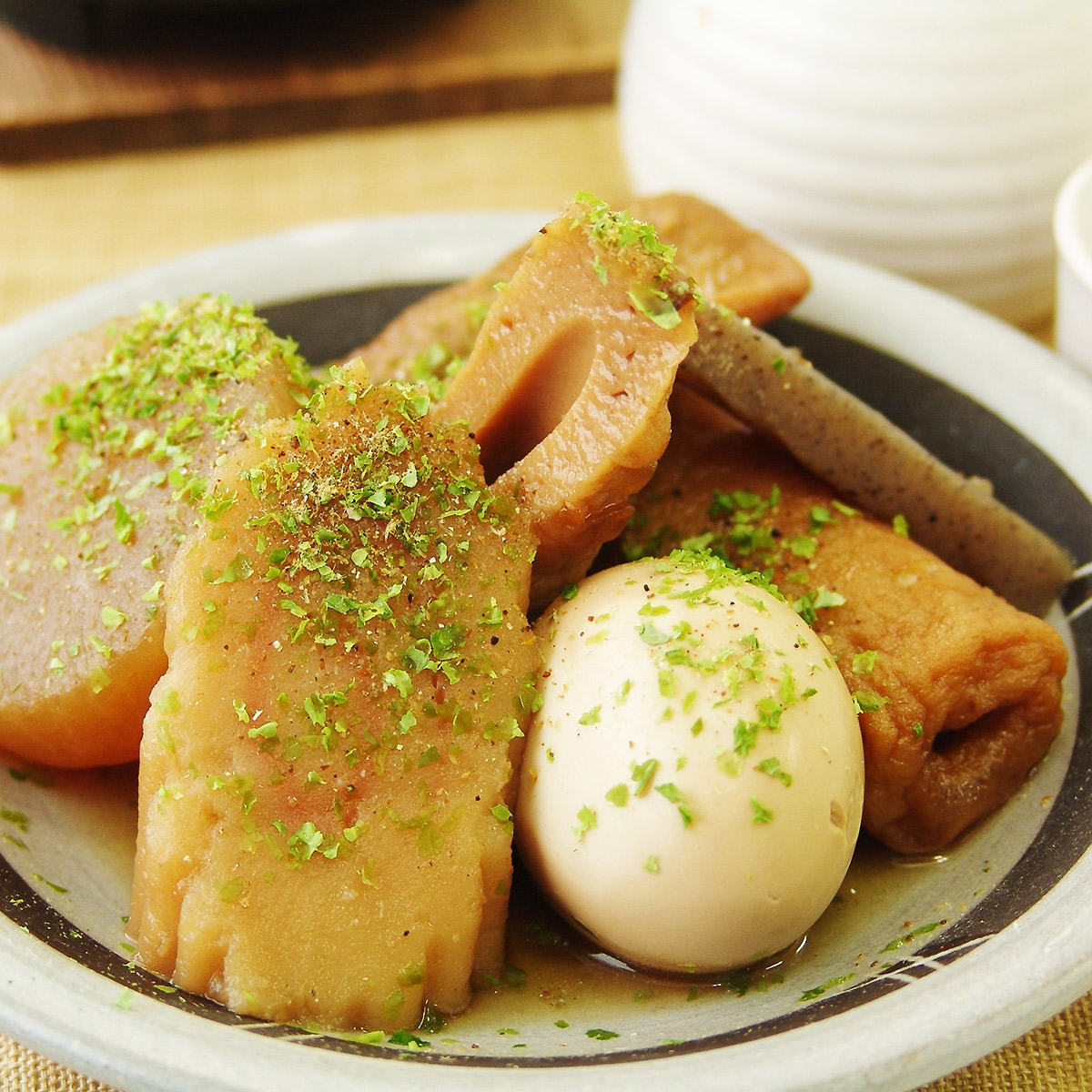 焼津は、昔から魚の町で、黒はんぺん、なると巻、かつおの水揚げも日本一。焼津おでんのスープのベースは、かつおダシで仕上げています。ダシ粉をかけて食べるのが焼津流です。