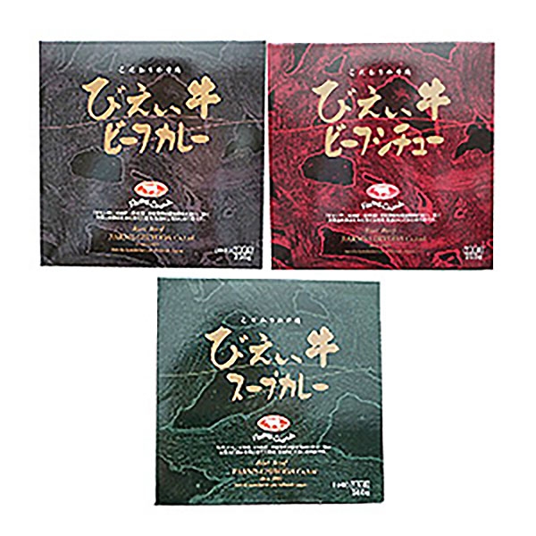 びえい牛ビーフシチュー(250g×1パック)、びえい牛ビーフカレー(230g×1パック)、びえい牛スープカレー(380g×1パック)