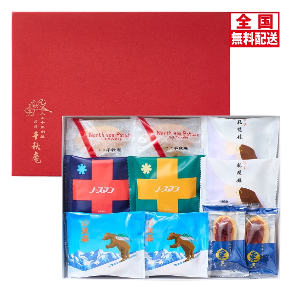 ノースマンこしあん×3個、ノースマンかぼちゃ×3個、山親爺(3枚包)×6個、ノースフォンポテト×4個、札幌娘×4個、デラックス栗まん×4個