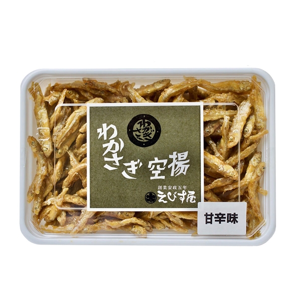 創業安政五年 伝統の諏訪の味を現代に伝える老舗湖魚川魚店「えびす屋」えびすやで人気のわかさぎの空揚げ。国産のわかさぎをカラッと揚げ、地元の醸造蔵のお醤油を使用して甘辛く仕上げてあります。甘露煮のように煮しめてありませんので、サックリしっとりとした食感です。