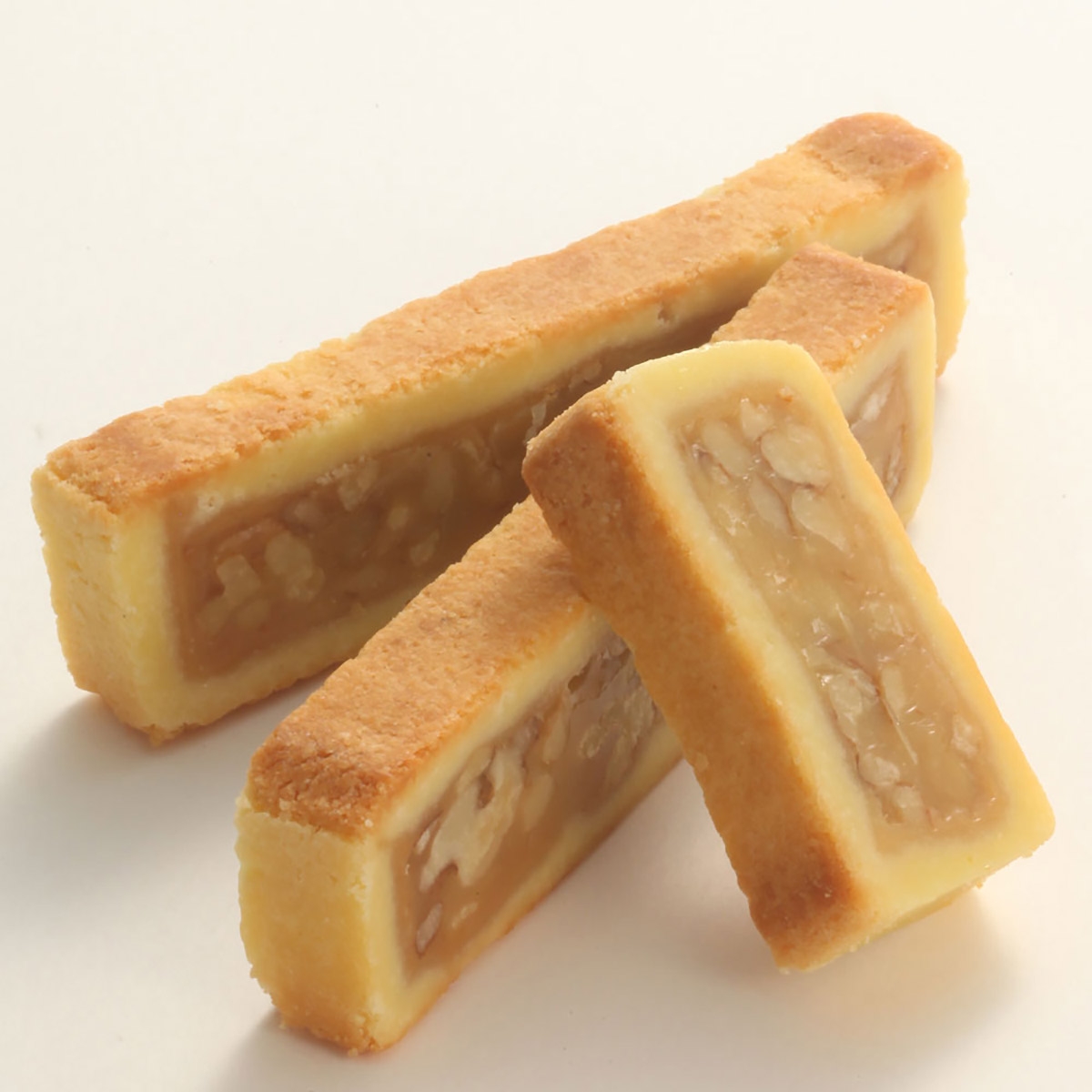 信州八ヶ岳山麓でとれる新鮮な牛乳を使って、じっくり煮込んだ「くるみやまびこ」。じっくり煮込んだ特製くるみキャラメルをサクサクのクッキーで包みました。ヌーベル梅林堂で最も多くのお客さまに愛されている自慢のお菓子です。