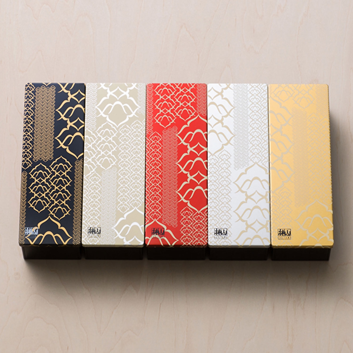 蒔絵の小箱のような風情に仕立てた化粧缶に代表商品の慶長、慶凰を詰合せました。赤坂あわせの5種類すべての味がお楽しみいただける5缶入の詰合せです。詰合せの小窓から覗く華やかな美しいデザインが改まった席のご進物にも適しています。
