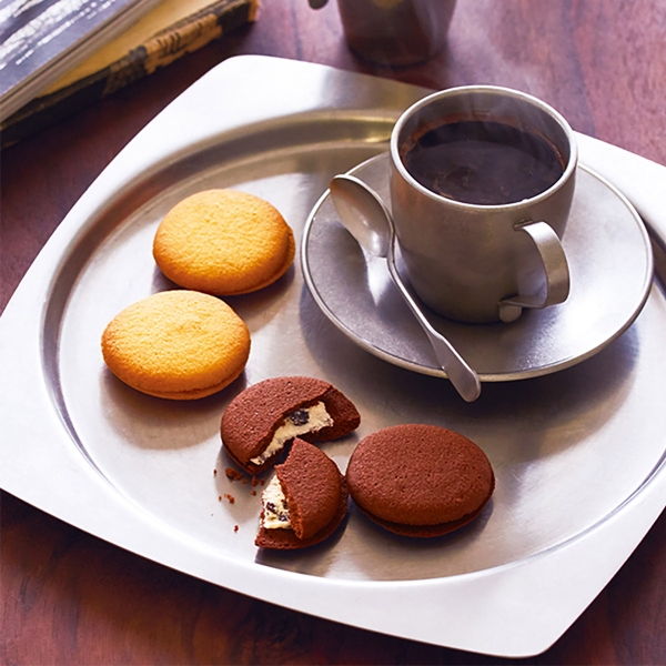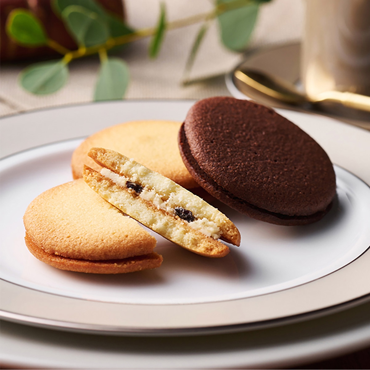 ラング・ド・シャ 甘さ控えめで、大人の味わいの焼き菓子。ラング・ド・シャ(猫の舌)と呼ばれる薄焼きクッキーに、香り高いラムレーズン入りクリームをサンドしました。