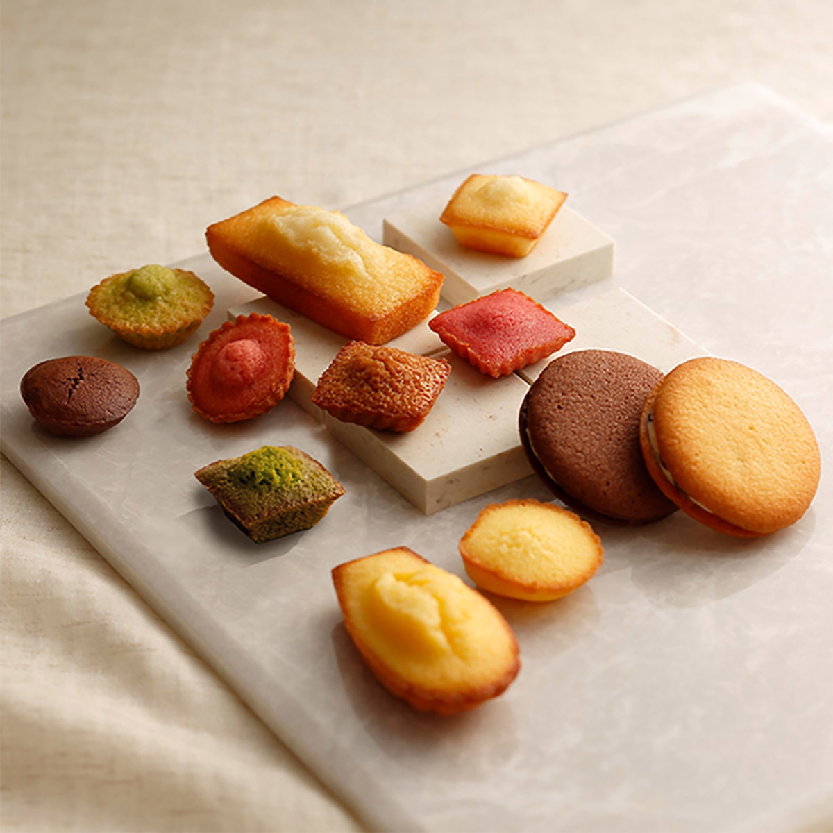 フィナンシェ 3個、マドレーヌ 2個、プティ・ガトー・アソルティ(フィナンシェ、マドレーヌ、キャラメル、抹茶各2個)、(ピスターシュ、フランボワーズ、ミルクチョコ、フレーズ各1個)、ラング・ド・シャ(プレーン2個、チョコレート1個)