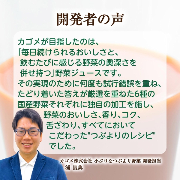 小ぶりなつぶより野菜+国産フルーツジュースセットはネットショッピング限定の特別なギフトセットです。小ぶりなつぶより野菜は、まるで野菜を食べているような新食感の野菜ジュースです。カゴメが理想を求めて厳選した6種の国産野菜を使用しています。原料の野菜は、おいしさを最大限に引き出すために、野菜ごとに異なる方法で搾汁されます。例えば、にんじんはやさしく搾り、えぐみを持ち込まない、フレッシュスクイーズ製法というカゴメ独自の技術で搾汁したものを中心に使用しています。トマトは、独特な香りを醸し出す加工方法と旨みを感じる加工方法の2種類を組み合わせることで、カゴメにしか出せない香りと味を生み出しました。葉野菜も破砕方法や搾り方の強さなどをそれぞれ調整しています。お子様からお年寄りまで家族みんなで楽しめるギフトセットです。