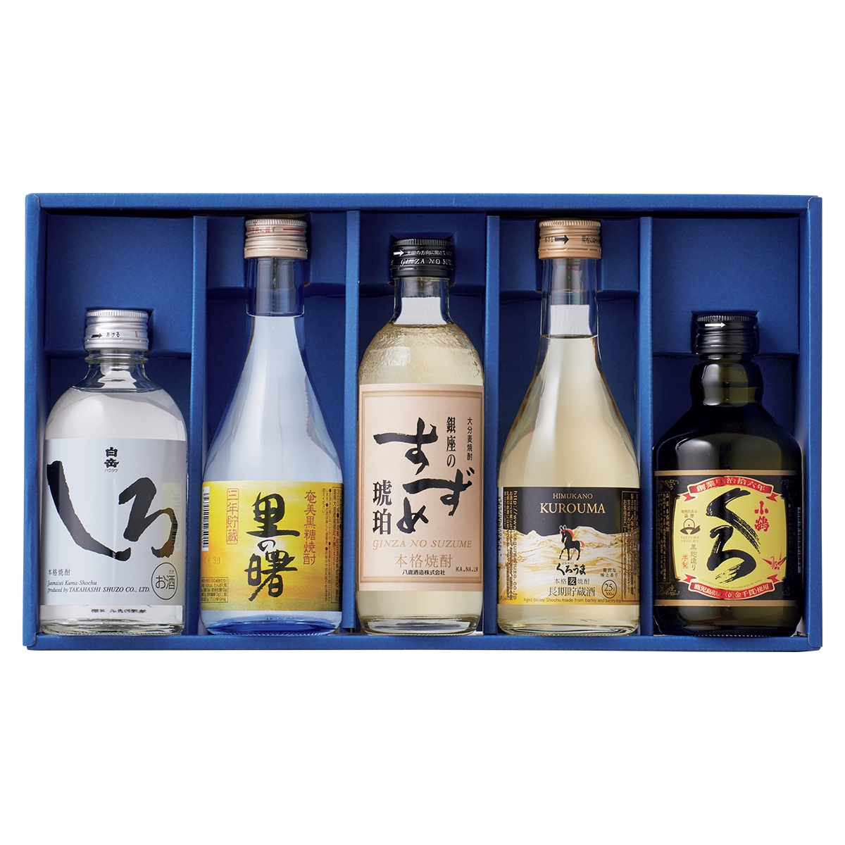 白岳しろ(米)25度、里の曙(黒糖)25度、銀座のすずめ琥珀(麦)25度、黒馬長期貯蔵(麦)25度、小鶴くろ(芋)25度 各300ml