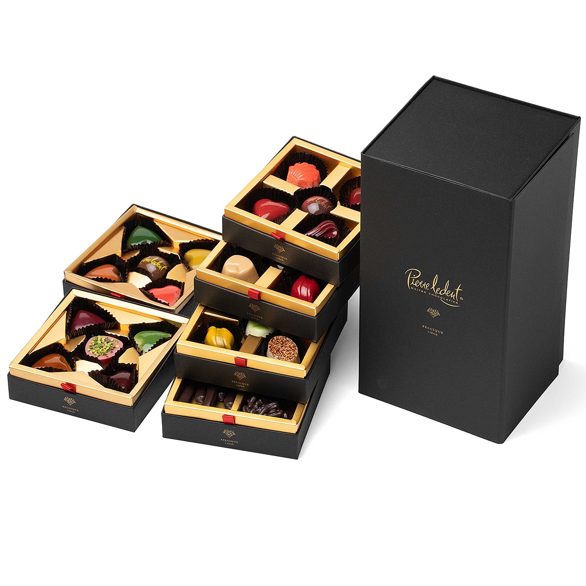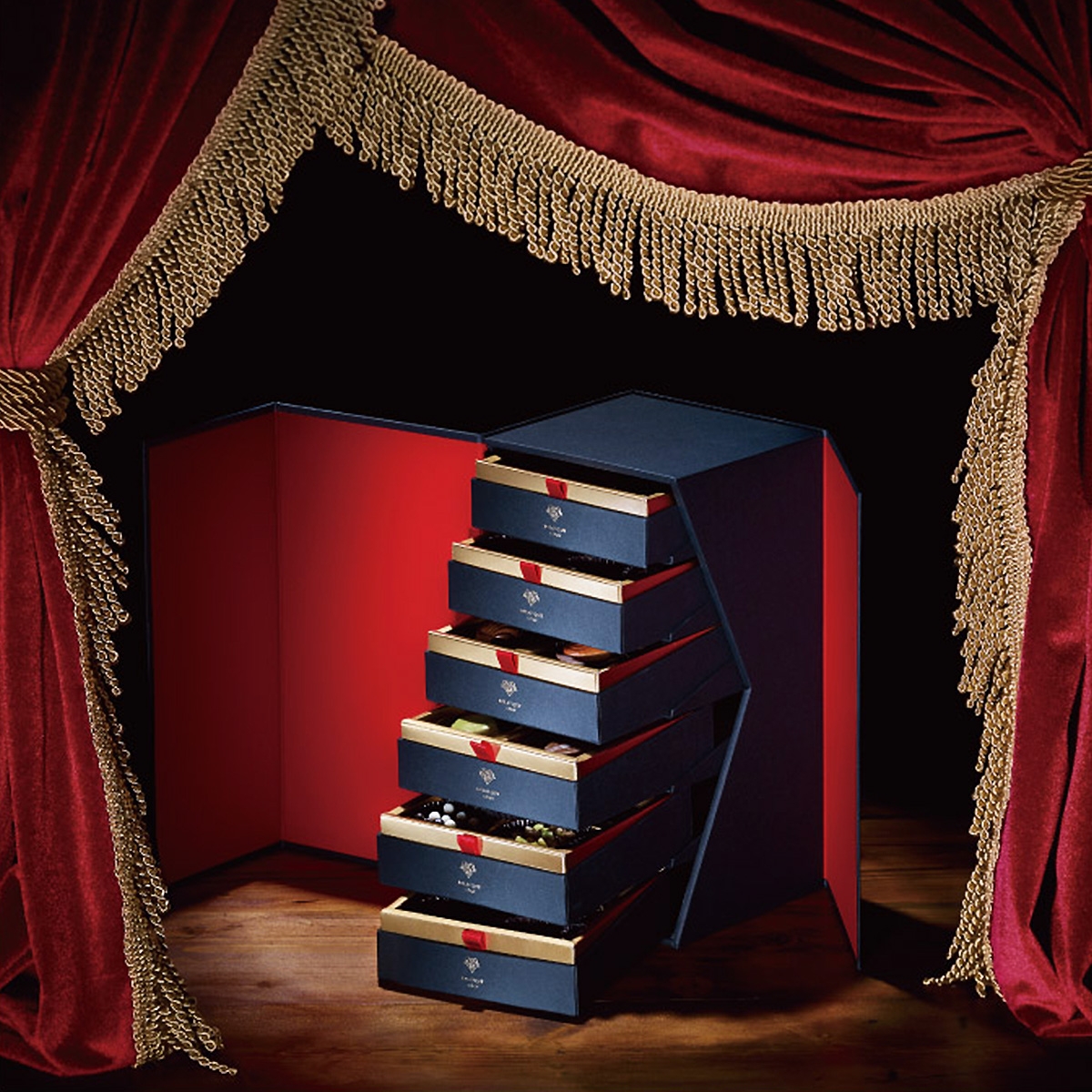 重厚感溢れる6段のシグネチャーボックス。新作から定番まで全てのショコラがアソートされた、ピエール・ルドンの手から創り上げる世界観が余すことなく堪能できる一箱。数量限定の「キング・オブ・シャトー」。