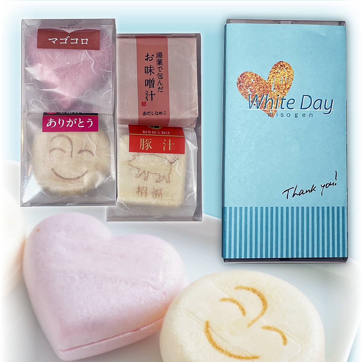 最中の表情に癒される看板商品「ありがとう」と、ピンクのハートの「マゴコロ」「福を招く豚汁」「湯葉で包んだお味噌汁(桜)」のセットです。「ありがとう」信州赤白合わせ味噌に豆乳に加え、ほっとするお味に仕上げました。「マゴコロ」玉ねぎを飴色になるまで炒めた、人気の洋風玉ねぎスープです。「福を招く豚汁」信州味噌に玉ねぎの甘味とうまみが合わさった、特製の豚汁です。「湯葉で包んだお味噌汁(桜)」相性ぴったり!赤だしとなめこのお味噌汁。国産もち米を使用した最中のもちもち、湯葉のつるっとした食感をお楽しみください。※絵柄が変わる場合もございます。