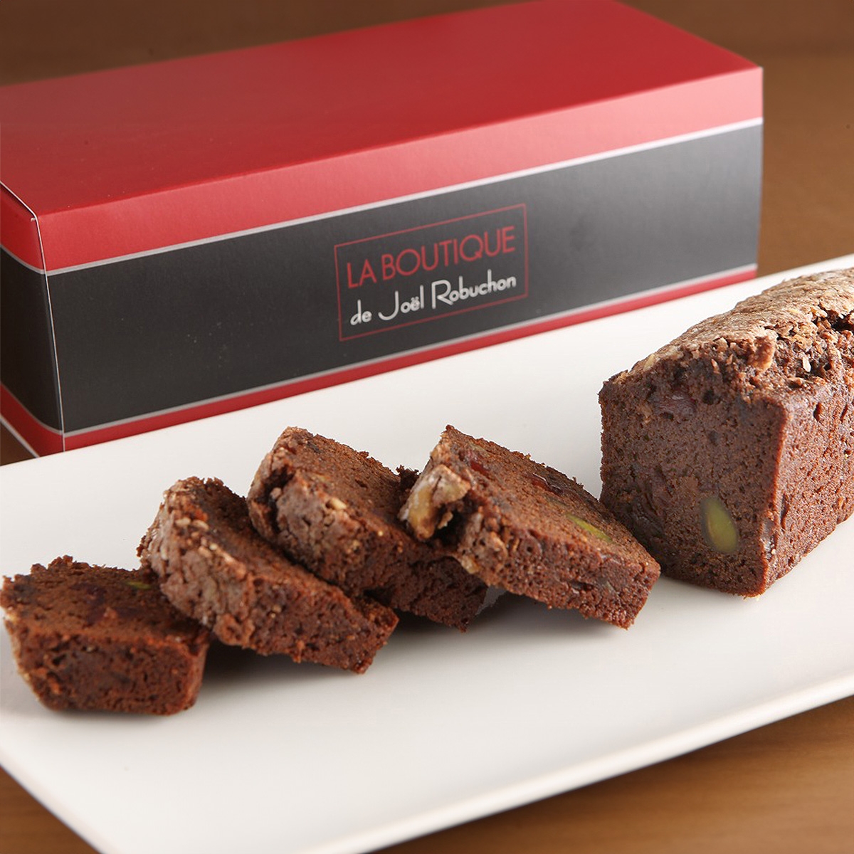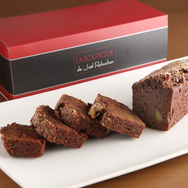 ラム酒漬けのドライフルーツとピスタチオを使った、ヒカリエ限定のチョコレートのパウンドケーキです。