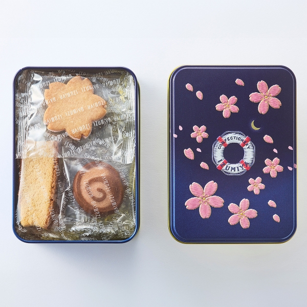 情緒ある夜桜を描いたデザイン缶に、サクラ味のクリームサンド、抹茶クリームサンド、サクラオ・レ、サクラサボイの4種類をアソート。