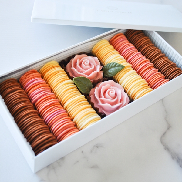 人気のラングドシャ3種のラングドシャ(バニラ、ベリー、ショコラ)を詰め合わせ、中央をチョコレートのバラで華やかに飾りました。※こちらの商品はスリーブに入ります。