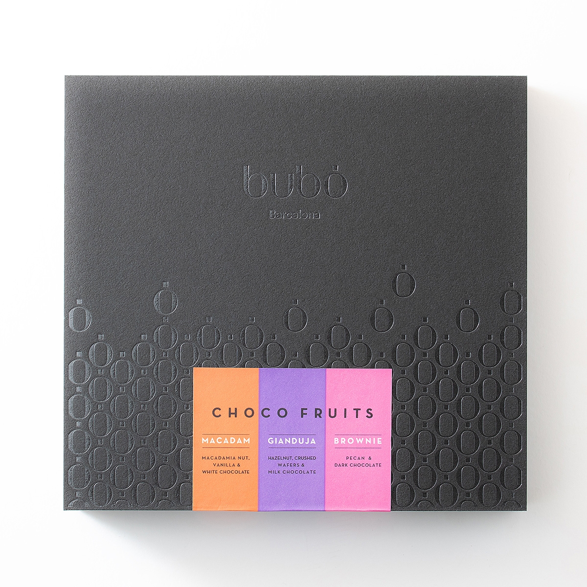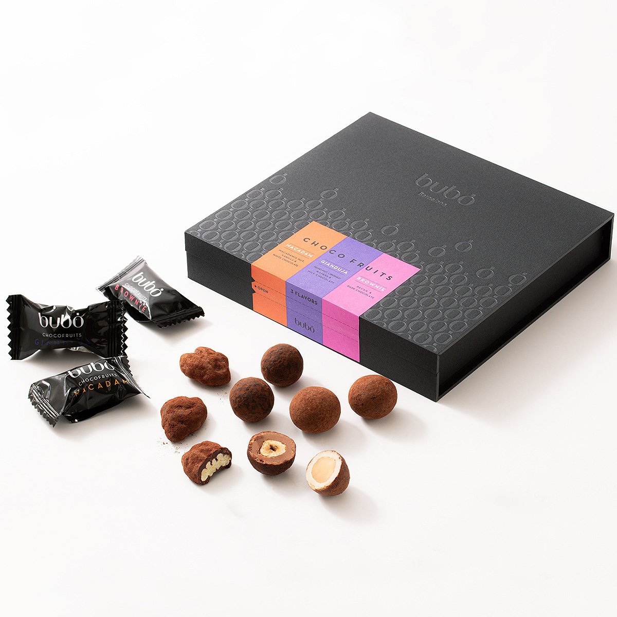 ブランドを代表するチョコレート「チョコフルーツ」を一粒ずつ贅沢に包んだアソートボックス。スタイリッシュなボックスに、人気のフレーバー「マカダム」「ジャンドゥーヤ」「ブラウニー」の3種類を詰め合わせました。大粒のナッツをチョコレートでコーティングし、ナッツとチョコレートの絶妙なバランスが、やみつきになる一品。贈り物やお手土産にもぴったりな一箱です。