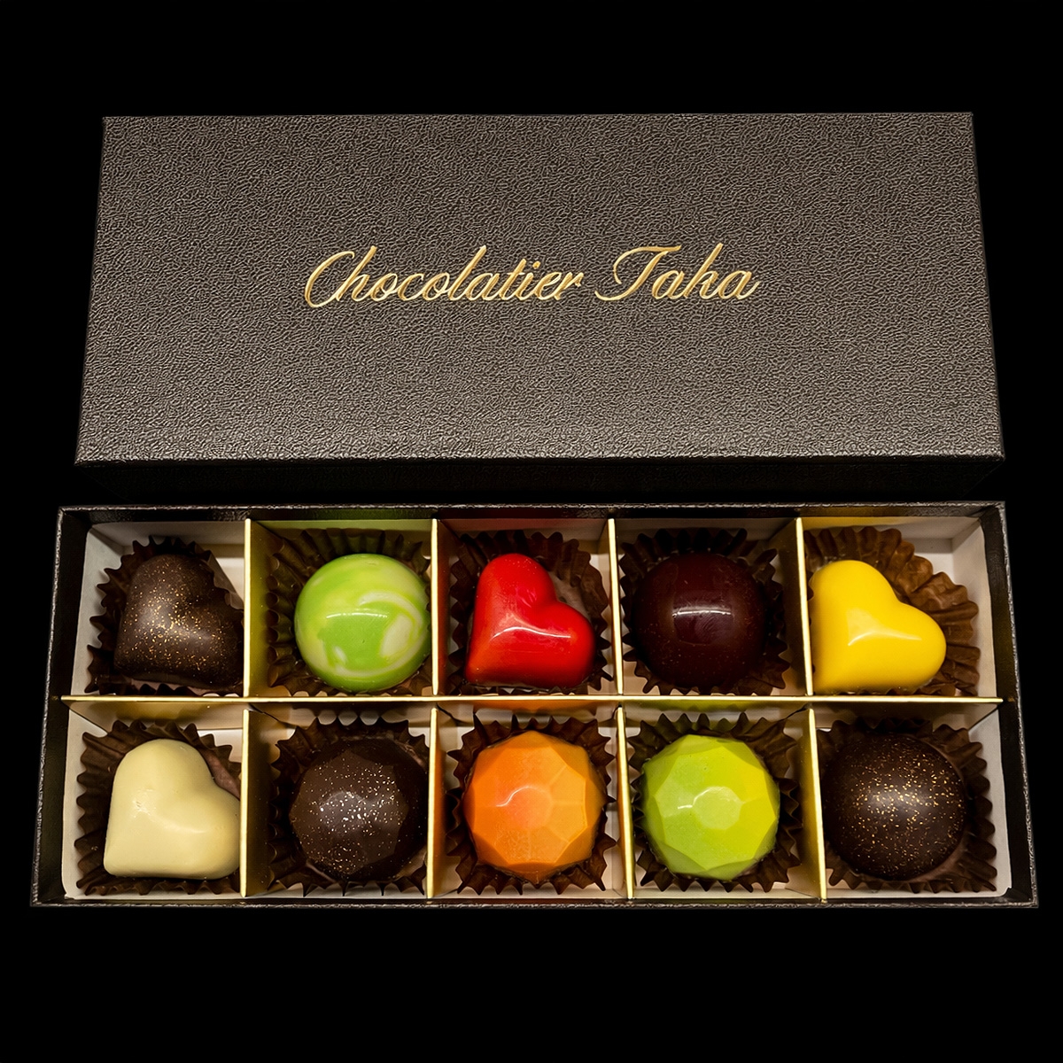 アールグレー(アールグレーのガナッシュ)、ピスタチオ(プラリネピスタチオ)、苺シャンパン(苺のコンフィチュールとシャンパンのガナッシュ)、フランボワーズ(フランボワーズのガナッシュ)、トロピカル(マンゴーとパッションフルーツのガナッシュ)、バニラ(バニラのガナッシュ)、キャラメルミルク(塩キャラメルとミルクのガナッシュ)、プラリネアマンド(プラリネアマンド)、柚子(柚子のガナッシュ)、サントメ(サントメ70%のガナッシュ)