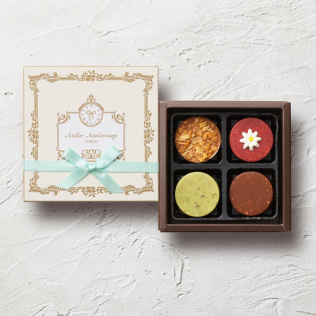 ベリー&ルビー×1個、ピスタチオ×1個、塩キャラメルショコラ×1個、コーヒーショコラ×1個