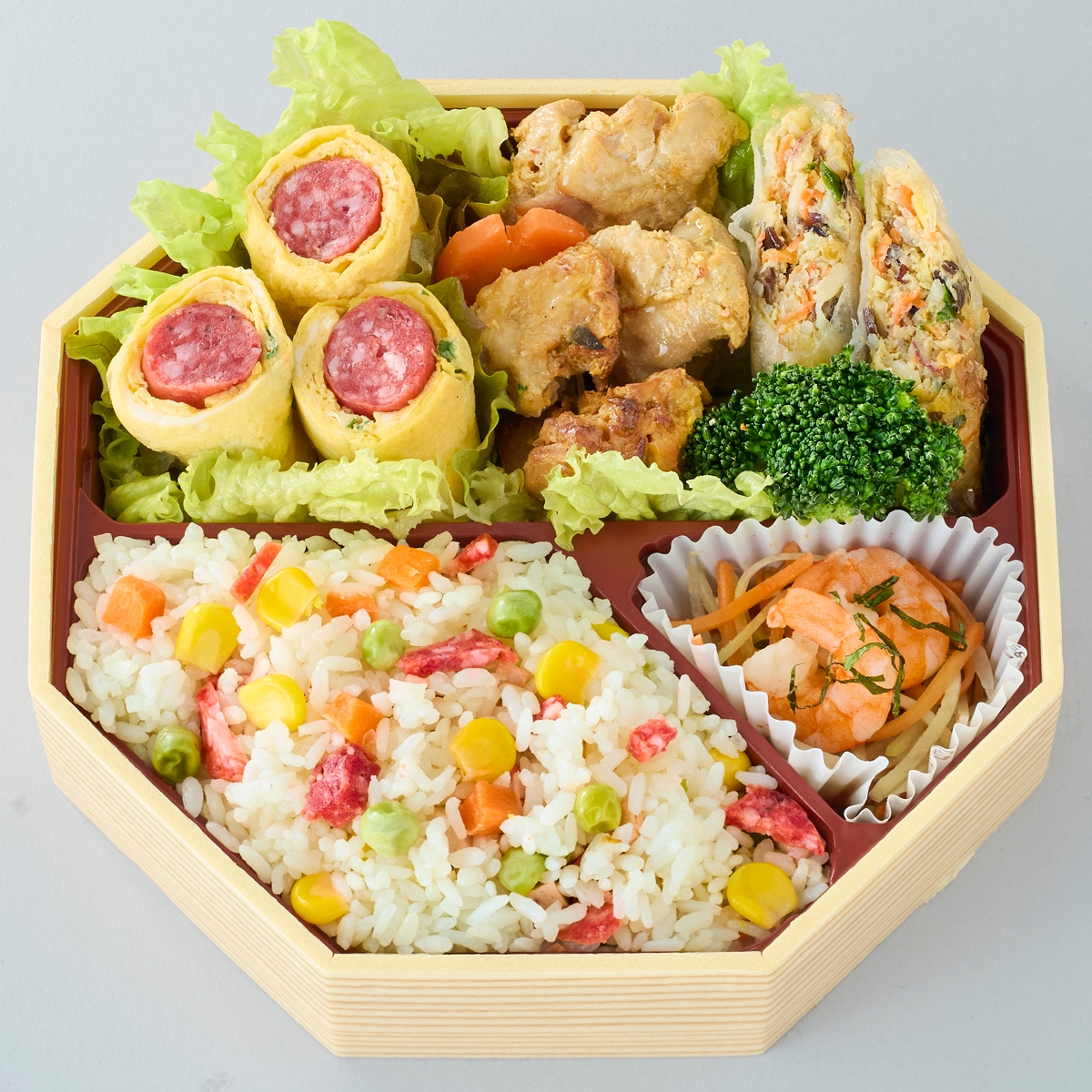 彩り野菜ごはん、玉子焼き、揚げ春巻き、サラダを盛り合わせ、春の実りと新しい始まりを表現しました。毎日を春のような彩りと前向きな気持ちで迎えられるお弁当です。