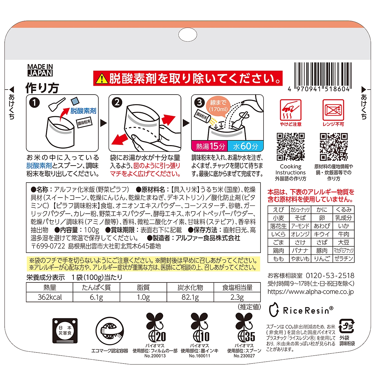 ≪防災特集≫アルファー食品 安心米 野菜ピラフ