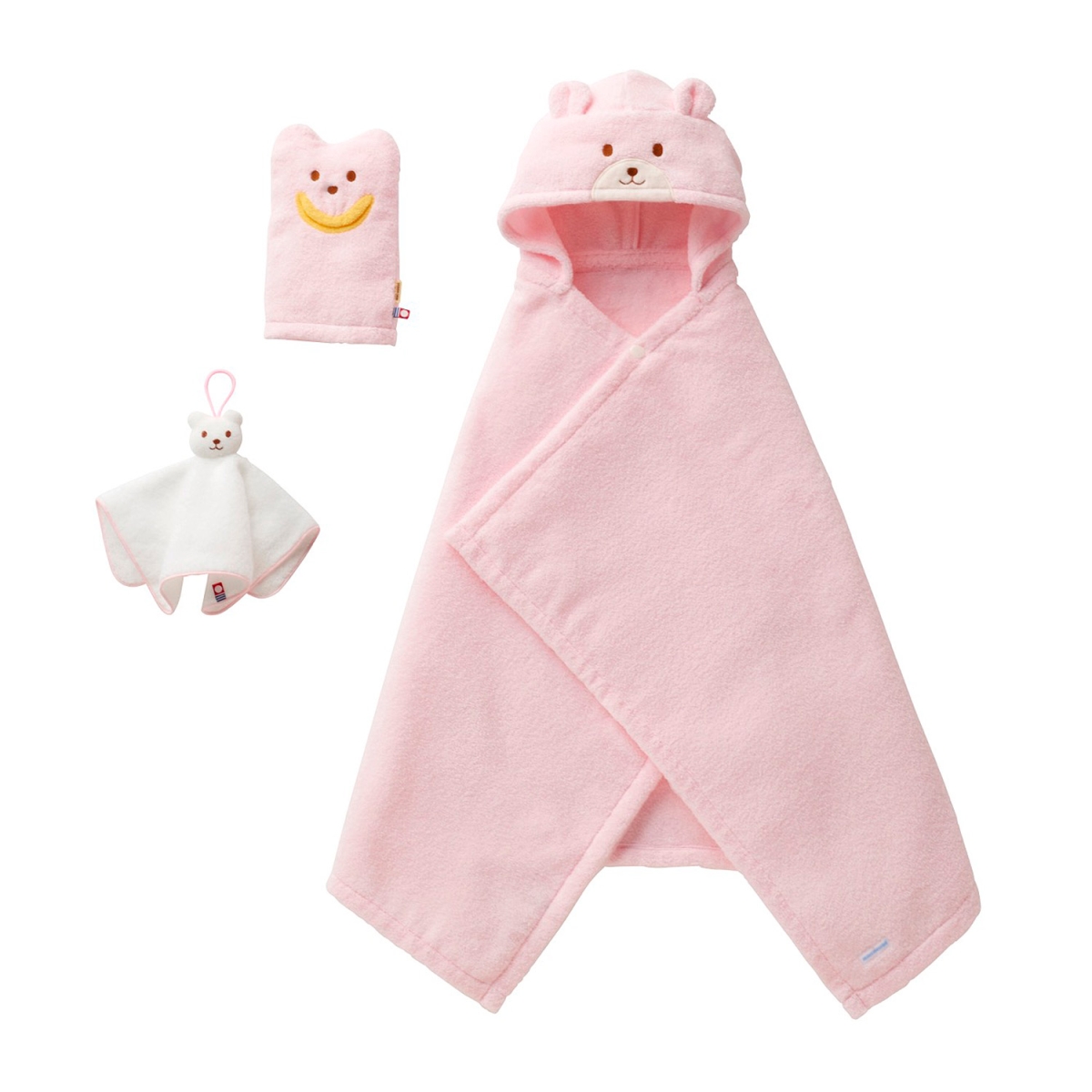 [バスポンチョ]102×60cm(フード含まず)、[ハンドタオル]25×25cm、[バスミトン]21×13cm