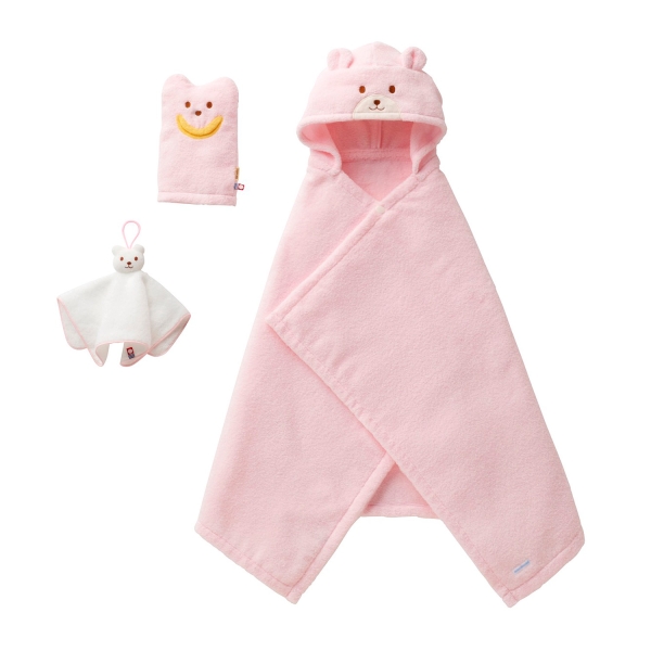 『今治タオル』を使用した、くまさんフェイスのバスポンチョ、バスミトン、ハンドタオルの3点セットです。撚りをかけずに紡いだ糸(無撚糸)を両面に使用しているため、ソフトな風合いで吸水性にも優れています。広げればバスタオル、ボタンを留めればポンチョとして使える、便利でかわいいタオルです。