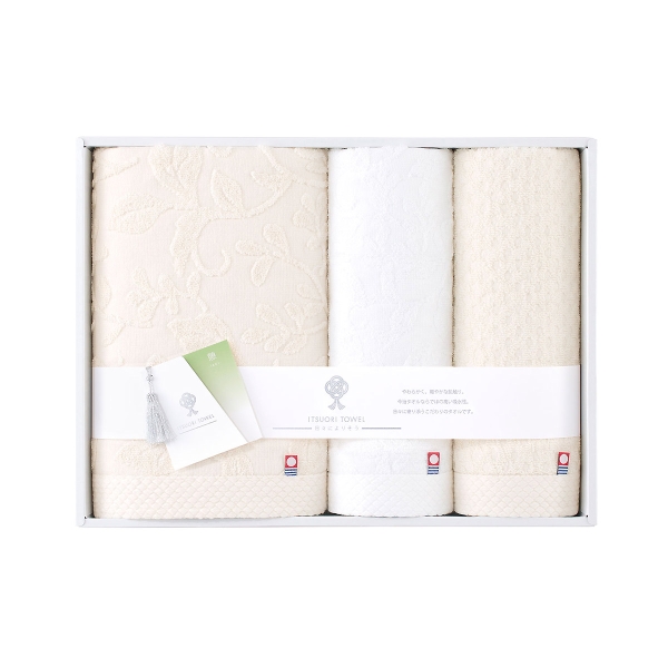 化粧箱サイズ:30×40×6cm、バスタオル×1(リーフベージュ)約60×118cm、フェイスタオル×2(ドットベージュ、リーフホワイト)約33×78cm