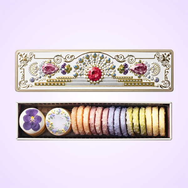 「目にもご馳走」ふたを開けるとそこにはいろとりどりのかわいいクッキー。一面に咲く花をイメージして一枚一枚丁寧に焼き上げました。お口に入れる前に少しの間、目でも味わってください。