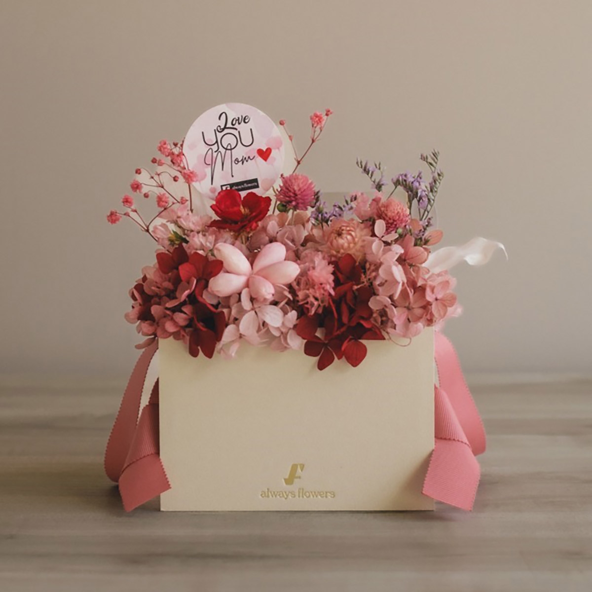 フラワーバッグアレンジ 母の日限定ドライ&プリザーブドフラワー ハートフルピンク S