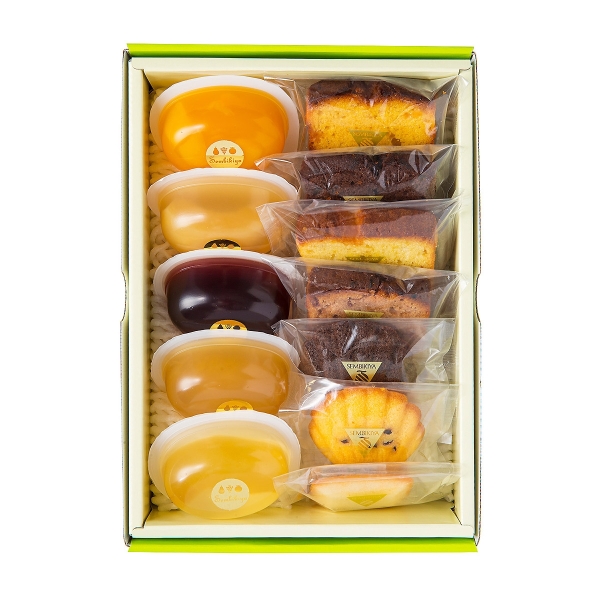 たっぷりの果汁と果肉を閉じ込めた定番のフルーツゼリーと、フルーツの風味を生かし、しっとりと焼き上げた焼き菓子を詰め合わせました。