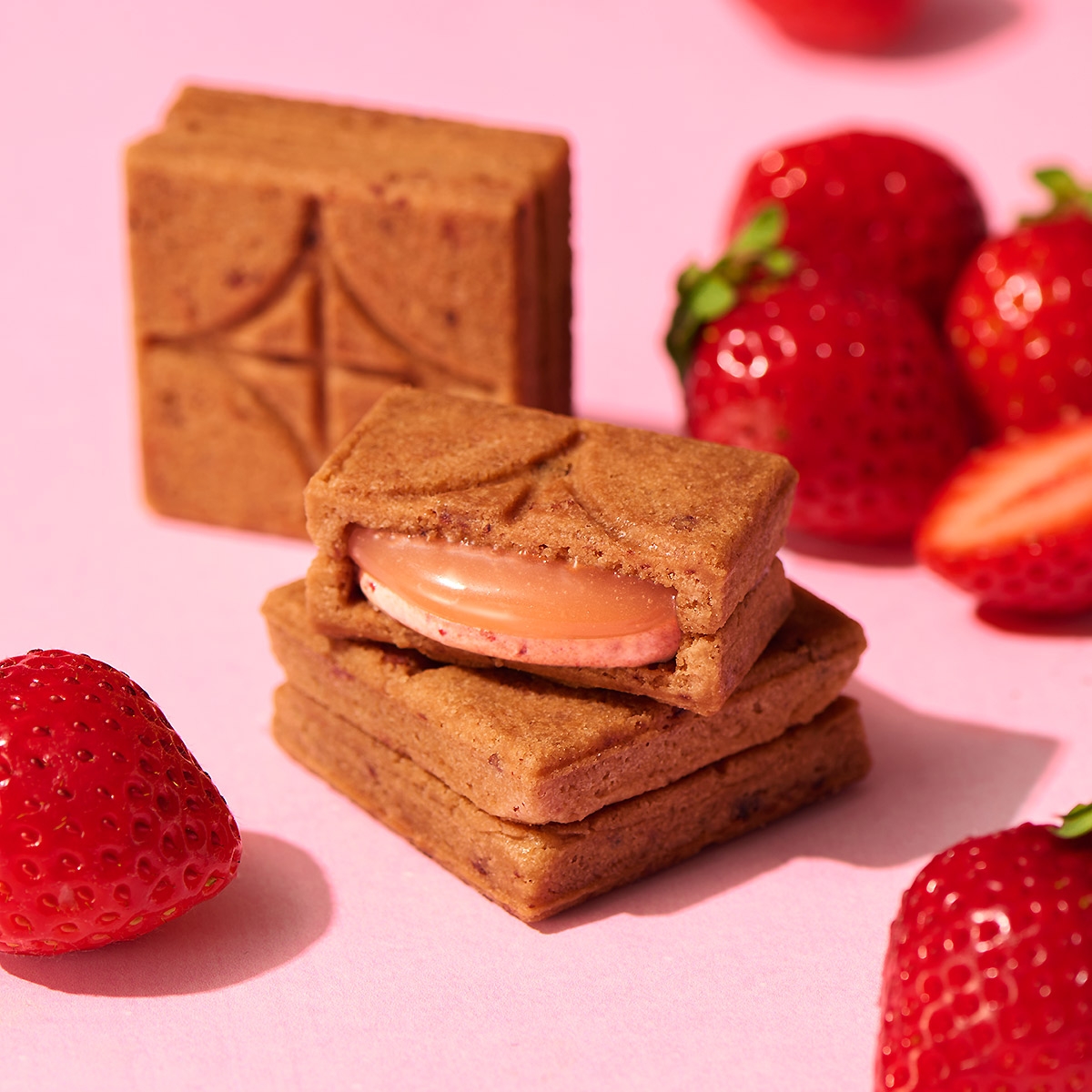 クッキー、バターキャラメル、バタークリーム全てにいちごを使い、いちごの芳醇な味わいが堪能できるバターサンド〈贅沢いちご〉。サクサクに焼き上げたクッキーに、いちごのペーストやフリーズドライのいちごを練り込んだバタークリームと、いちごの濃縮果汁を使用したバターキャラメルをはさみました。いちごの味わいが口いっぱいに広がり、プチプチとした食感も楽しめる、贅沢ないちごのマリアージュをお楽しみください。