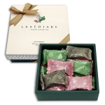 華やかな香りと甘酸っぱいストロベリーのガナッシュ、奥深いコクが特徴の宇治抹茶を合わせたガナッシュ、カカオとやさしいミルクの味わいのミルクチョコレートガナッシュをそれぞれミルクチョコレートのシェルに閉じ込めた葉っぱの形のチョコレート。うすいチョコレートのパリッとした食感から広がるなめらかな口どけをお楽しみください。