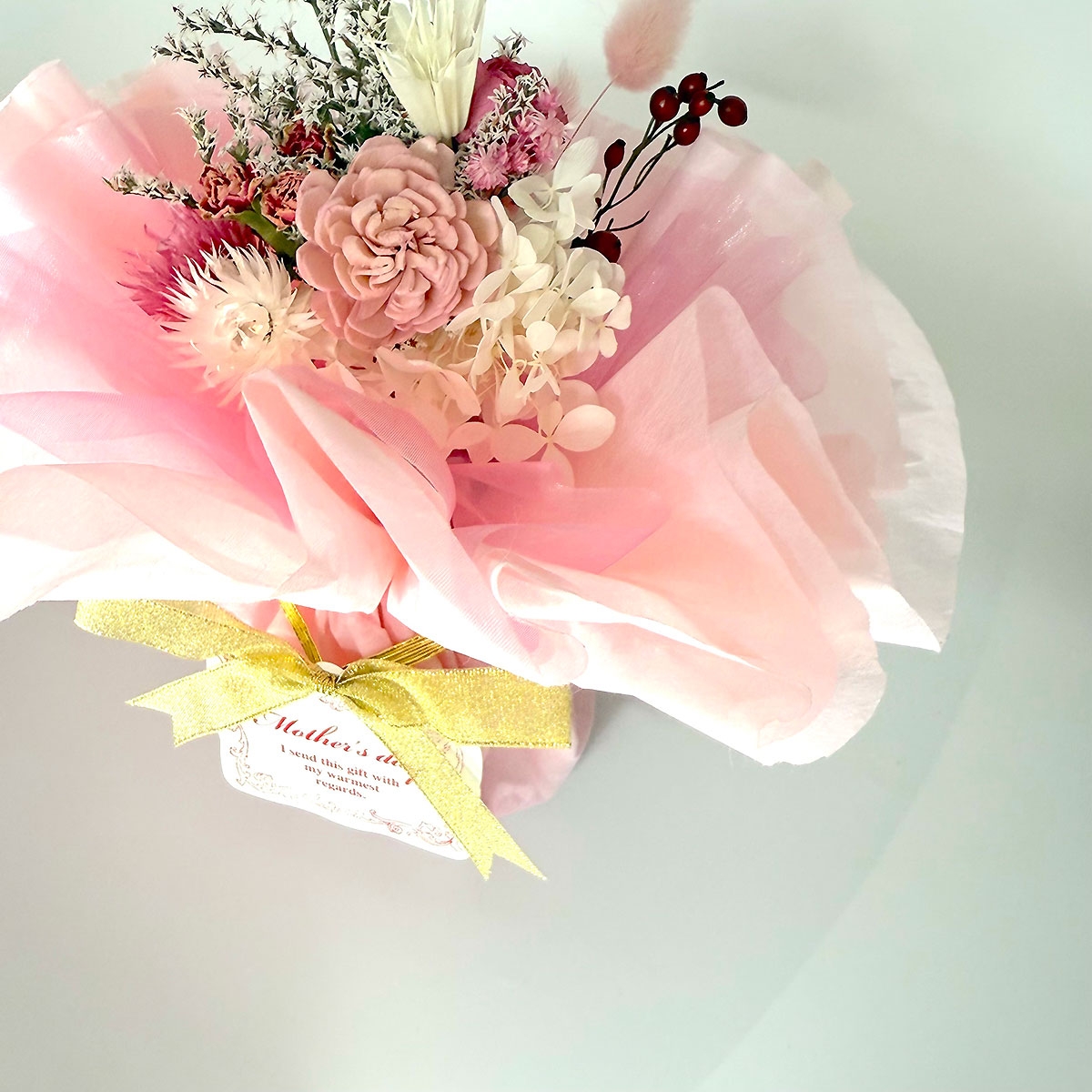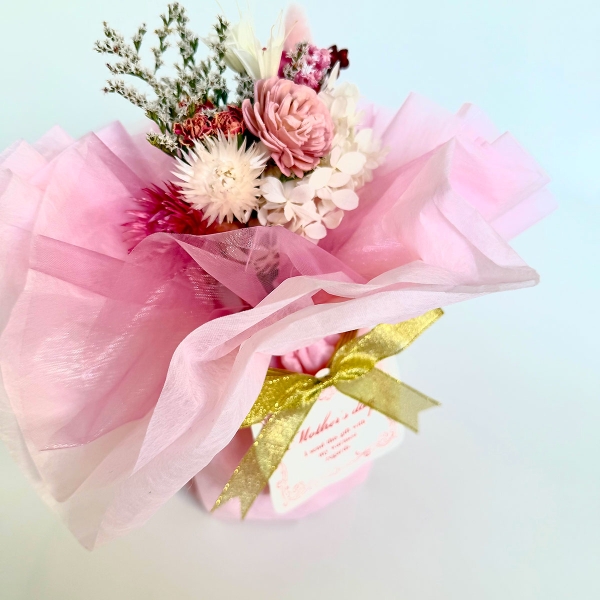 母の日のメッセージタグとリボンがついた、そのまま置けて水やりいらずのナチュラルなお花のインテリアです。こちらはSサイズになります。Sサイズにはカーネーションのドライフラワーや、ホワイトのプリザーブドフラワーのアジサイがあしらわれています。ドライフラワー、プリザーブドフラワー、ソーラーローズなどを優しい色でまとめたブーケを、ピンクの不織布とオーガンジーで包みました。