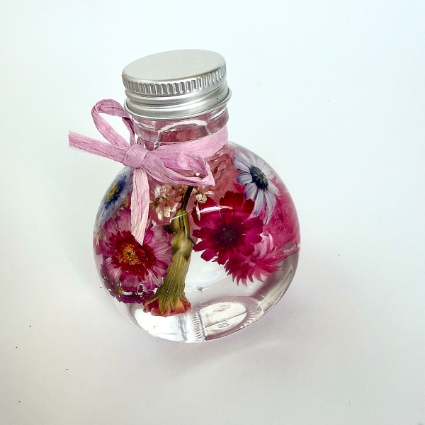 ナチュラルなお花をガラス瓶に入れ、ハーバリウムオイルで閉じ込めたハーバリウムです。