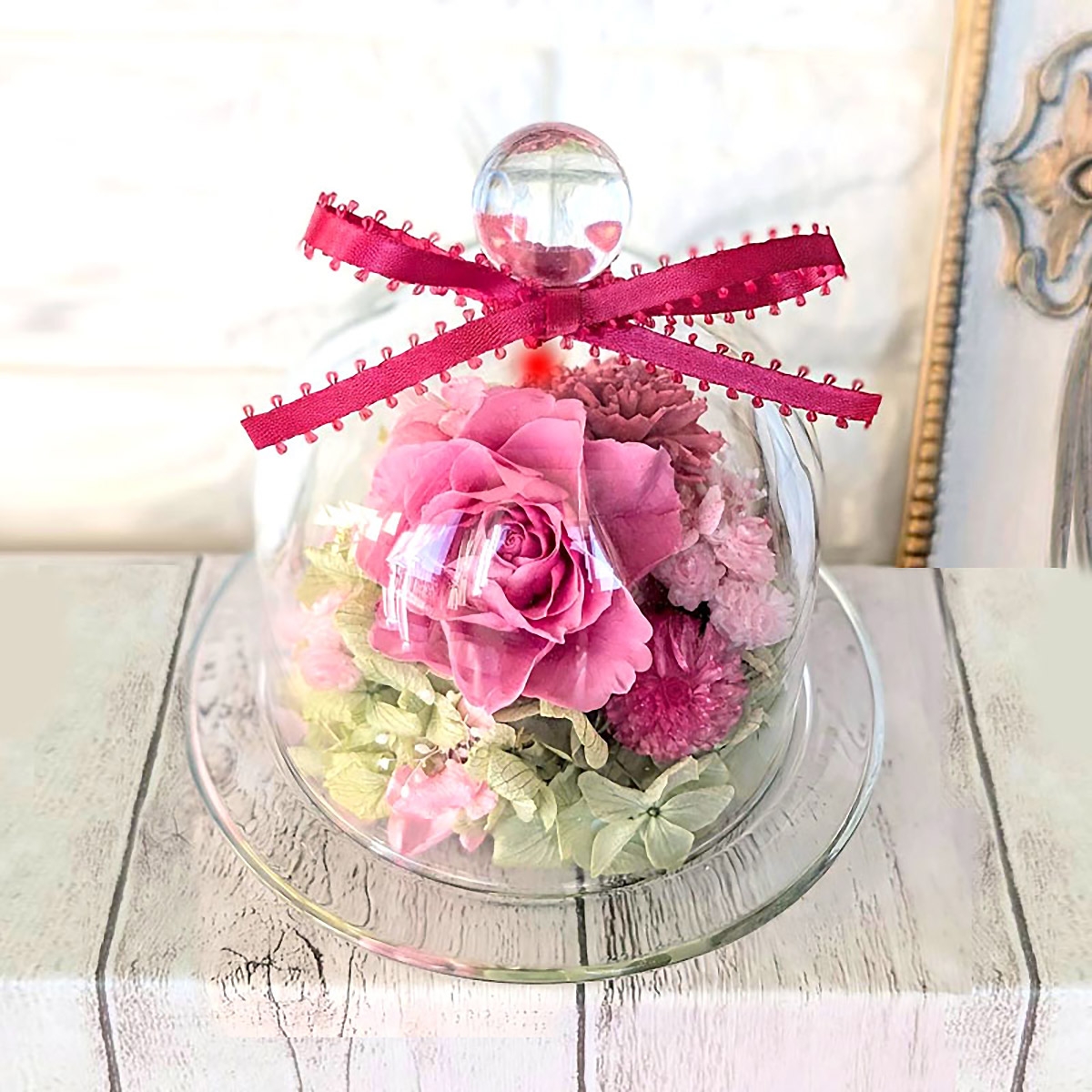 美しいピンクのプリザーブドフラワーのバラが目を引くガラスドームアレンジメント。ガラスドーム入りのため、お花にほこりがかからず忙しいお母様の手をわずらわせることなく、日常に癒しのひとときを添えるギフトです。バラ、あじさい千日紅などのプリザーブドフラワーの組み合わせをお楽しみください。Bell Roseでは、日々の感謝の気持ちをお伝え出来ますよう一点一点手作業にて丁寧に制作させていただいております。