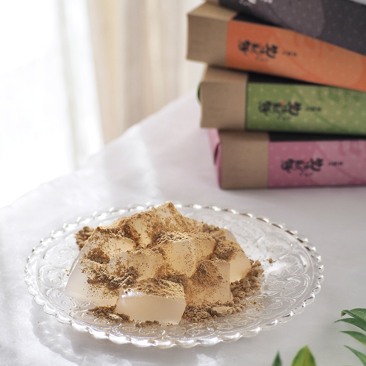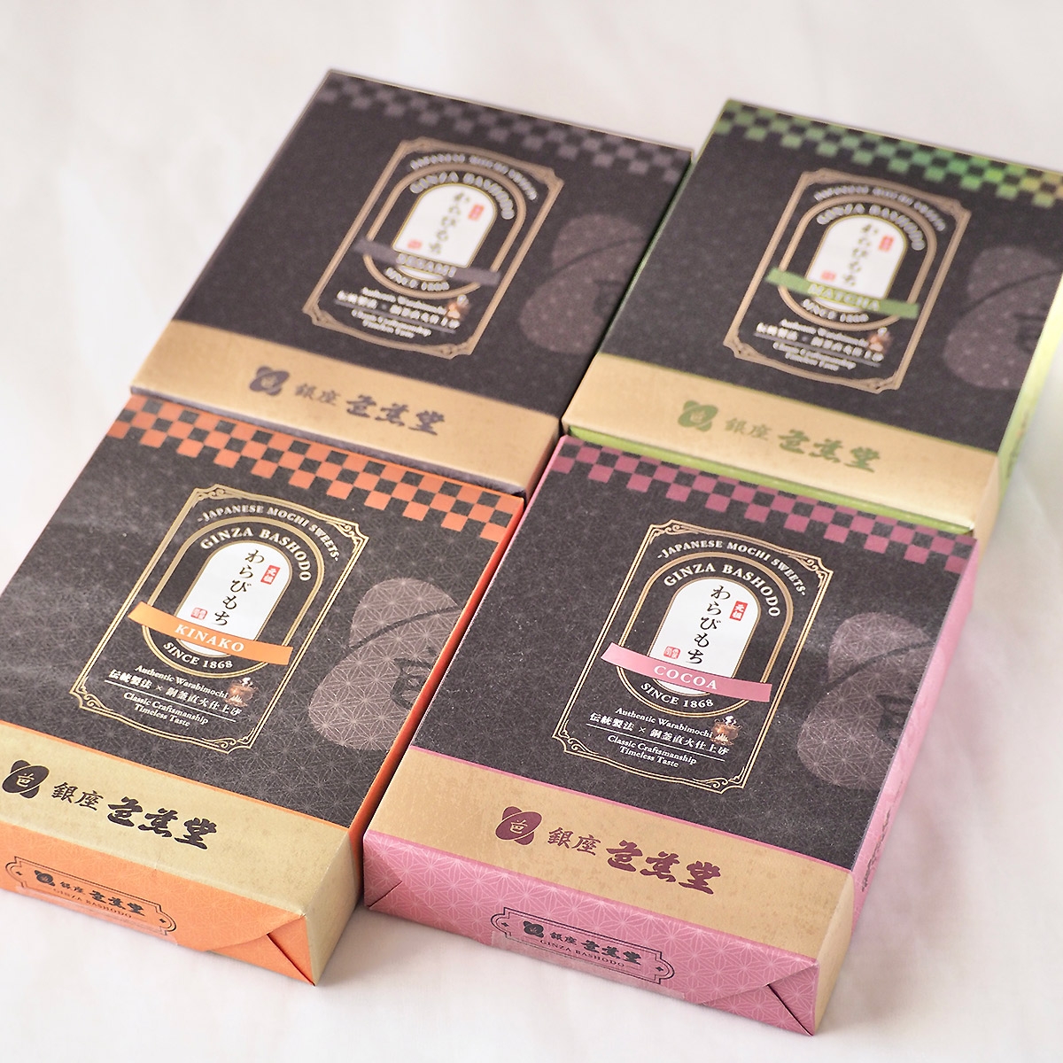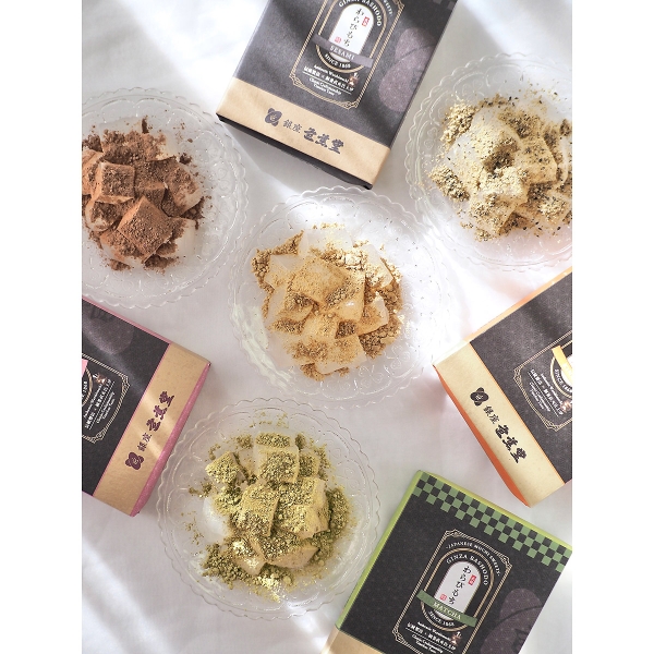 芭蕉堂の看板商品「笑来美餅(わらびもち)」を丹波種黒大豆きなこ・抹茶・ごま・ココア4種の味で楽しめるセットです。