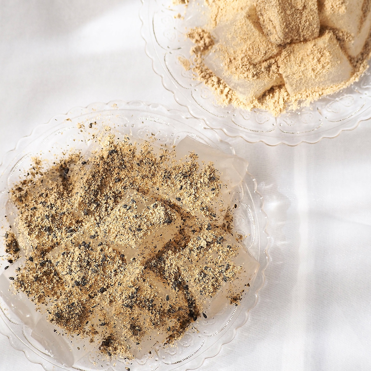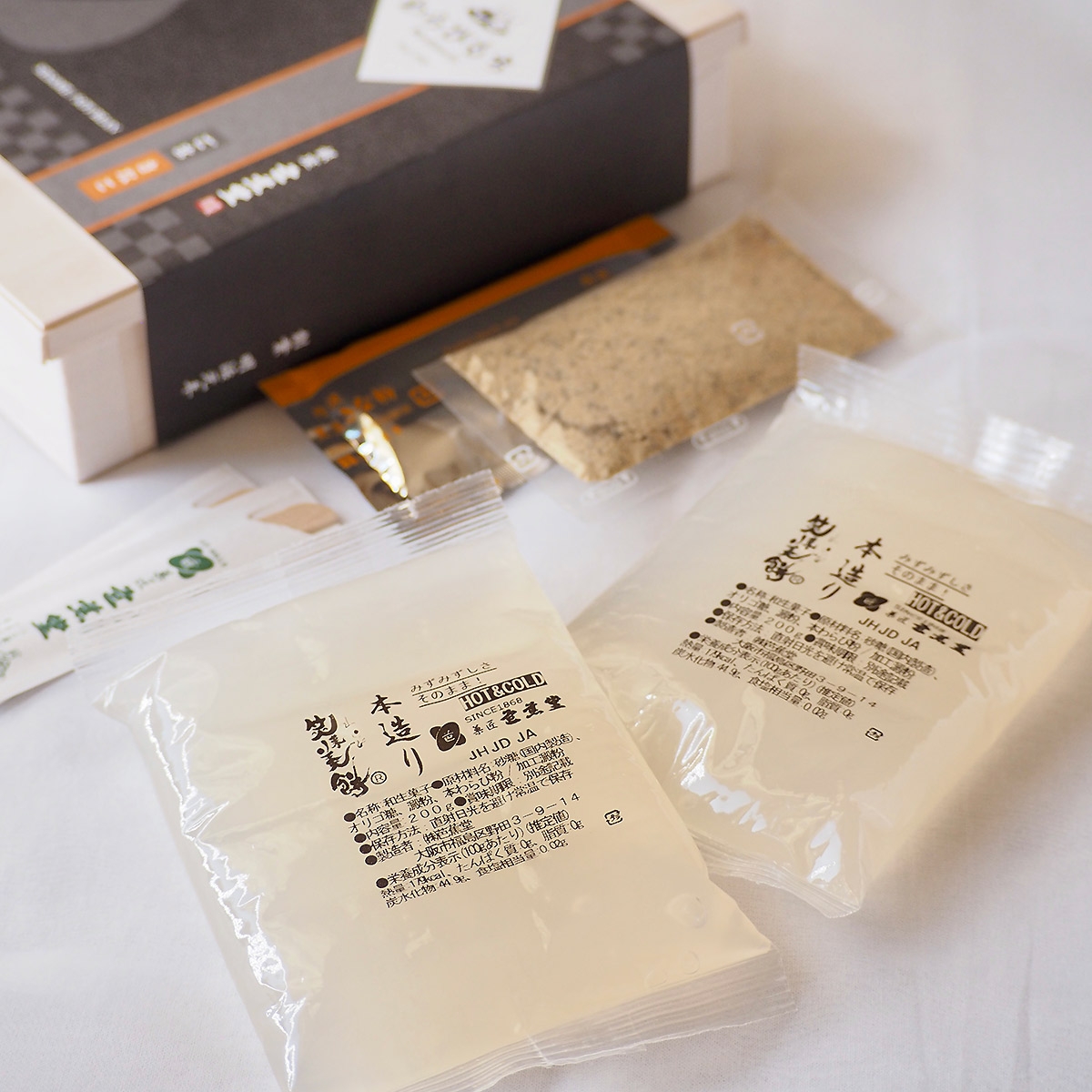 炊きたてのわらび餅を瞬間密封して出来たての美味しさをとじこめました。風味豊かな黒ごまと、黒豆きな粉をブレンドした「黒ごまきな粉」でお召し上がりください。きな粉とごまのセットです。