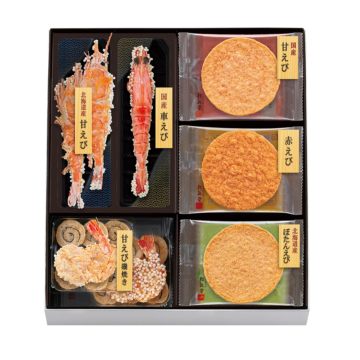 2カップと11袋(甘えび姿焼き×1カップ、車えびあられ焼き×1カップ、甘えび磯焼き×2袋、甘えび炙り焼き×3袋、赤えび炙り焼き×3袋、ぼたんえび炙り焼き×3袋)