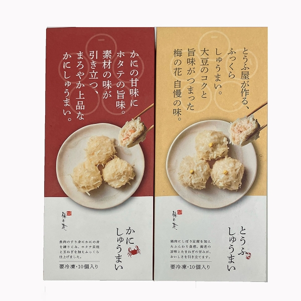《梅の花》自慢の「とうふ」と「かに」のしゅうまいセット。2つの味を一度にたっぷり楽しめる詰め合わせです。