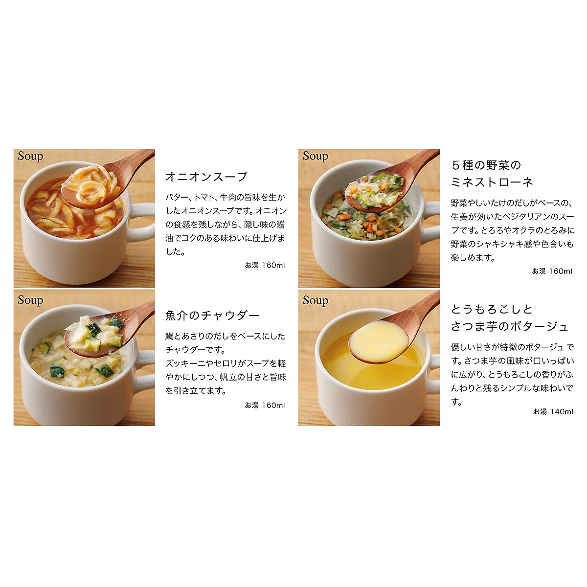 「母の日は、やさしいごちそう」Soup Stock Tokyo のフリーズドライは、素材本来の味や特徴、だしの旨味などを活かし、風味や香りを引き立てながら、奥行きが出るように仕上げています。具材感や食感を楽しんでいただくスープや素材の旨味をしっかりと味わえるポタージュ、私たちがおいしいと思える一杯にこだわりました。母の日のギフトにお勧めです。Soup4種類を2個ずつ白いギフト箱に入れ、母の日の掛け紙をかけてお届けします。