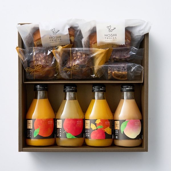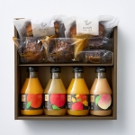 ジュース(山口島そだち・青森林檎・山梨 和歌山桃・ミックスジュース(国産蜜柑・沖縄パイン・青森林檎))×各1本 各180ml、カップケーキ(オレンジ・マロン)×各1個、パウンドケーキ(オレンジピール×チョコ・ブルーベリー×クリームチーズ)×各1個、ブラウニー(ネーブル・パイナップル)×各1個