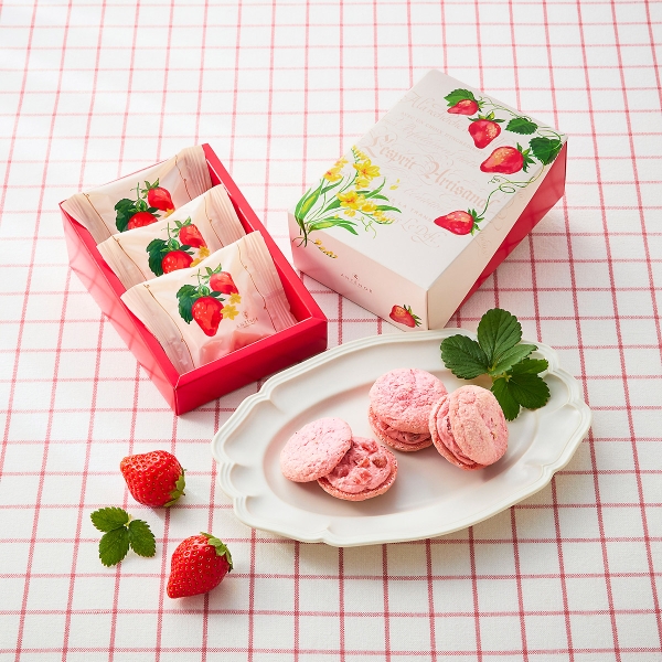 ほんのり甘酸っぱい苺果肉入りの苺チョコクリームを、ふうわり食感の苺のダックワーズ生地でサンド。