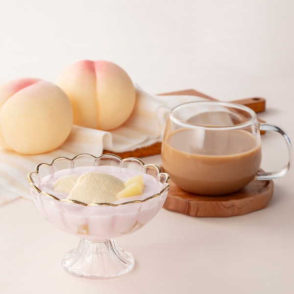 果肉入りのももヨーグルトを、紅茶がふわっと香るミルクティームースに重ねました。紅茶をヨーグルトと合わせることでミルクティーのような味わいに仕立てたムースを、優しい甘さのももヨーグルトと一緒にお楽しみください。