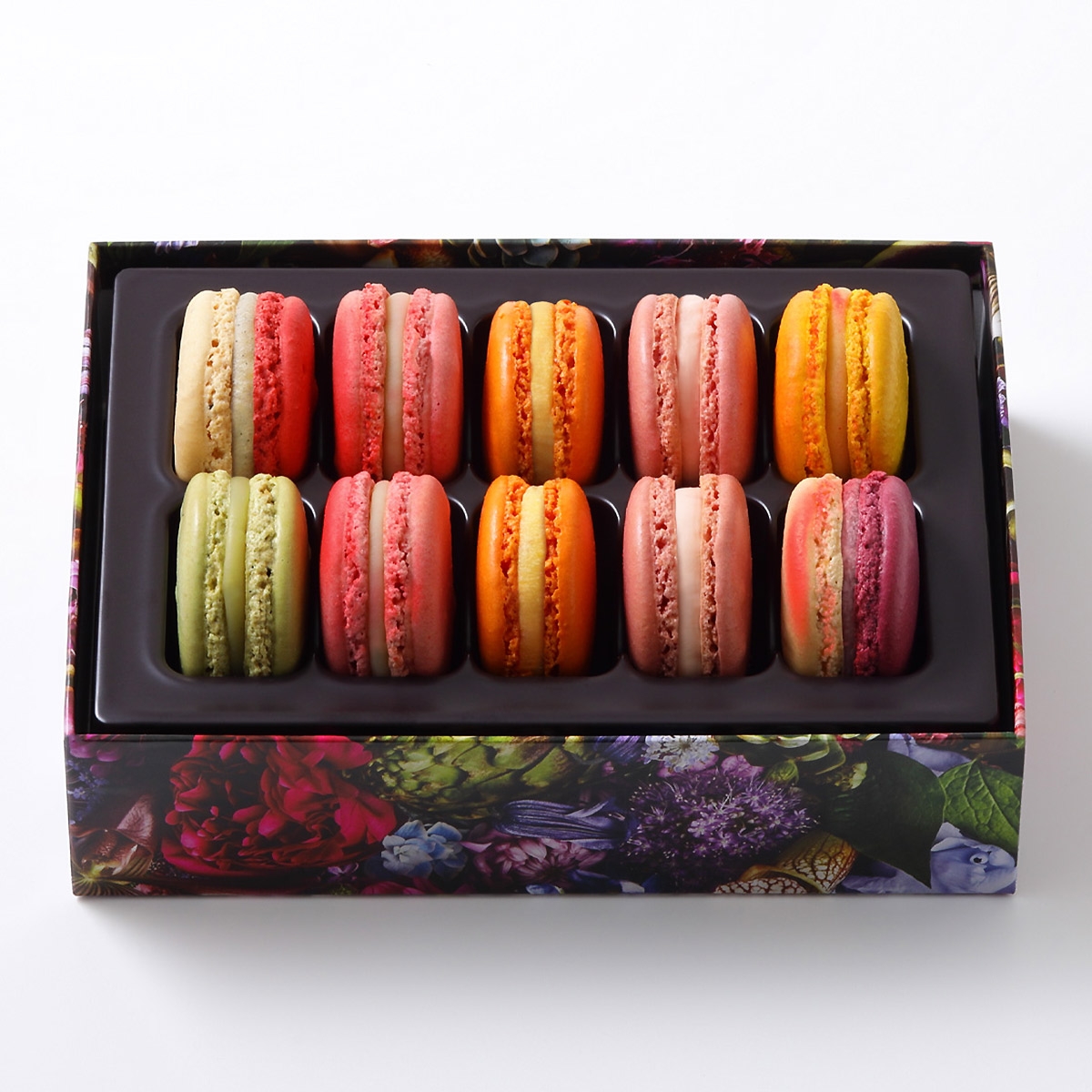 日本の桜の花が変身したかのような「ジャルダン ジャポネ」、ピスタチオの魅力を余すところなく活かした「アンフィニマン ピスターシュ」など、カラフルで華やかな7種のマカロンを詰め合わせました。フラワーアーティスト東信さんによるアレンジメントを施した限定BOXでお届けいたします。