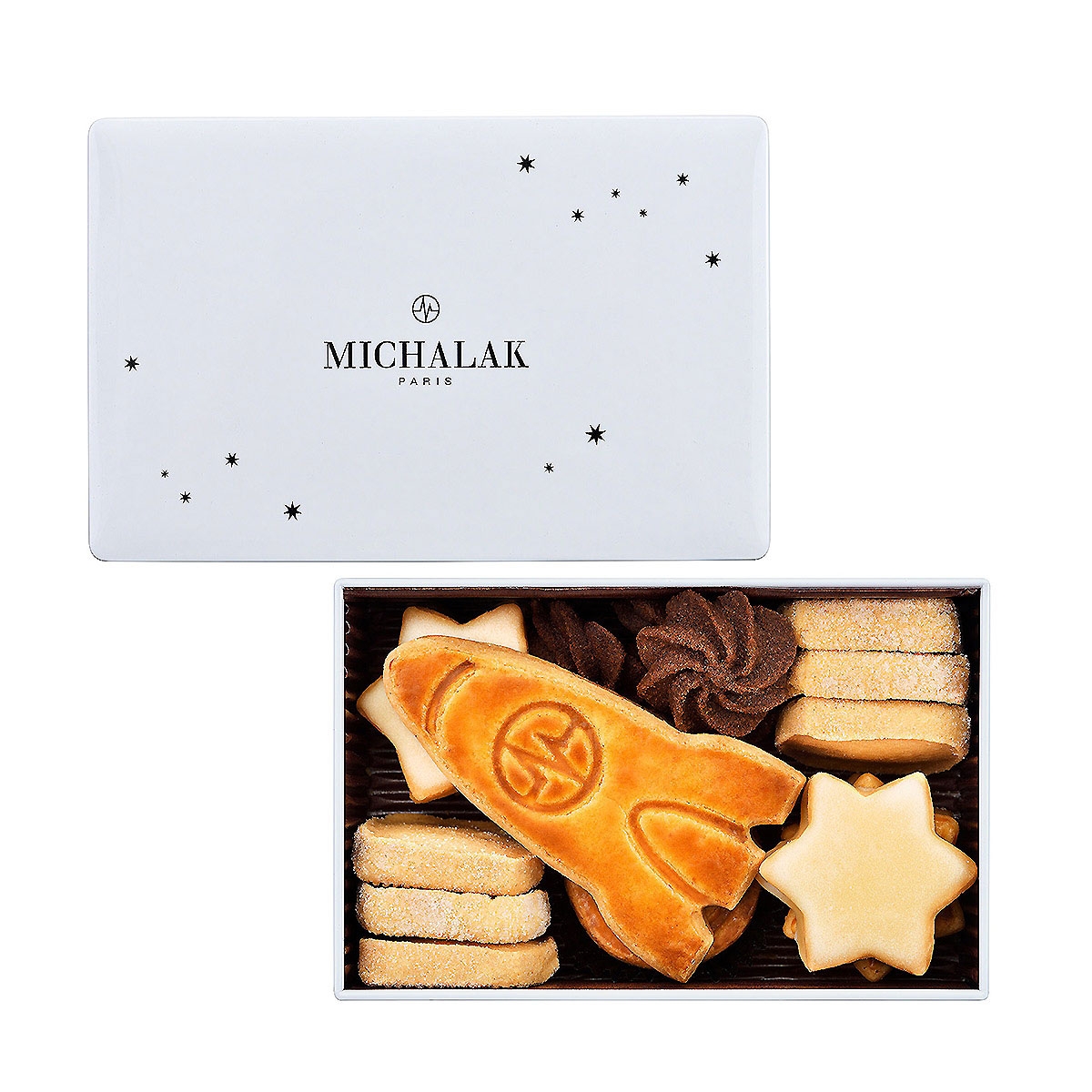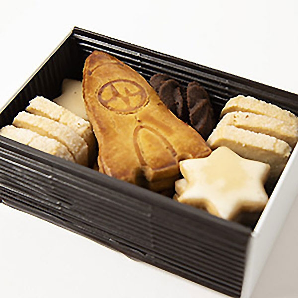 ミシャラクのテーマである宇宙をコンセプトに、ブランドのロゴマークが刻印されたロケットサブレや星の形のサブレなど、6種類のサブレを缶に詰め合わせました。