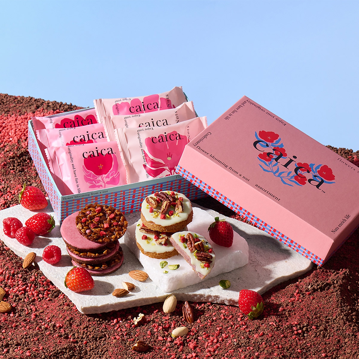 caicaの2種のベリーフレーバーを贅沢に楽しめる詰合せです。ストロベリーとラズベリーの2種の甘酸っぱいベリーで満たされた「フロランショコラサンド〈ダブルベリー〉」、しっとりとしたホワイトチョコレートケーキに、ピーカンナッツの香ばしさ、ピスタチオのやわらかなコク、ドライストロベリーの甘酸っぱさを重ねた「ショコラホワイトケーキ〈ベリー〉」の2種を一度に味わいいただけます。