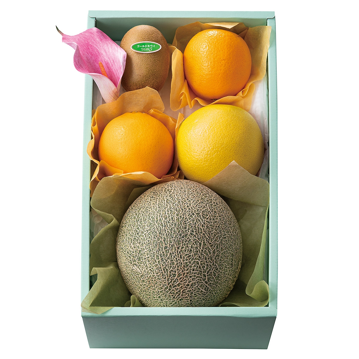 メロン(熊本県、茨城県または千葉県産)、河内晩柑(愛媛県または熊本県産)、サンゴールドキウイ(ニュージーランド産)×各1、オレンジ(アメリカまたはエジプト産)×2、カラーオーナメント付
