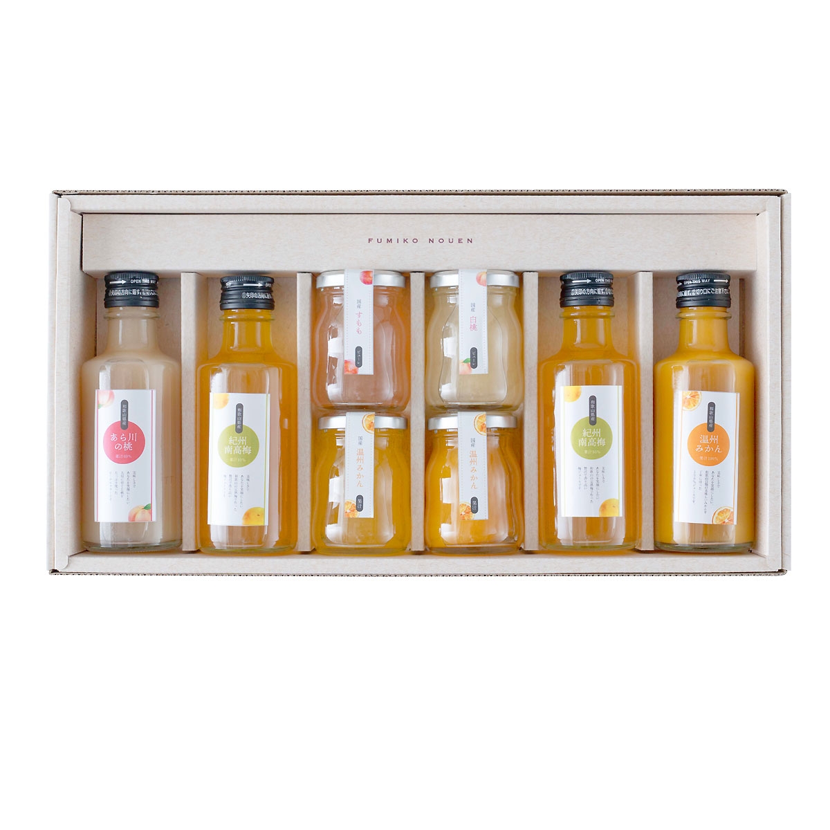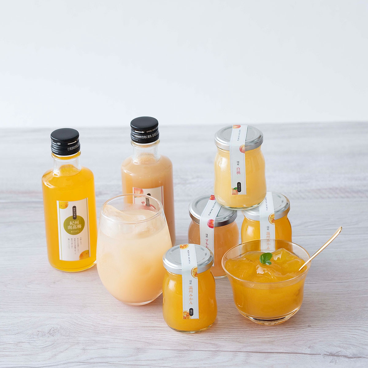 みかんゼリー100g×2個、すももゼリー・白桃ゼリー 各100g×1個、温州みかんしぼり(ストレート果汁100%)・あら川の桃しぼり(果汁40%) 各180g×1本、紀州南高梅しぼり(果汁10%)180g×2本