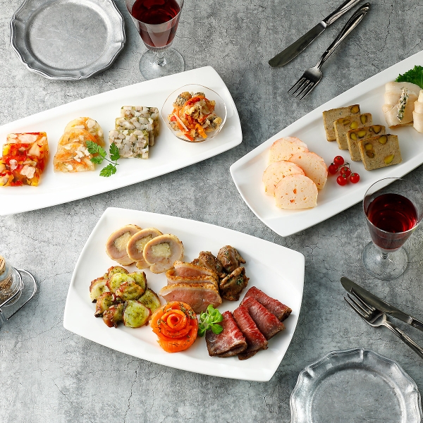 スズキのエスカベッシュ60g、蒸し鶏のトリュフマヨネーズ×6、ジャンボンブランペルシェ×3、スモークサーモントラウト(ディル風味)×4、砂肝のコンフィ×3、合鴨のコンフィ×3、海老のテリーヌ×4、シュリンプアスピック×3、国産黒毛和牛の和風ローストビーフ×4、タコのバジルソース40g、蒸し鶏と野菜のコンソメアスピック×3、チキンガランティーヌ×3、豚肉と鶏レバーのパテ(パテドカンパーニュ)×4