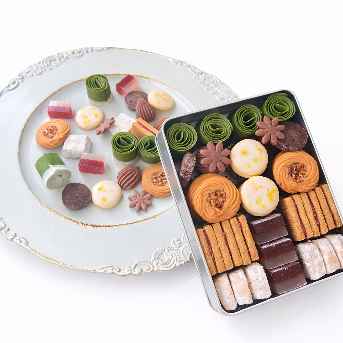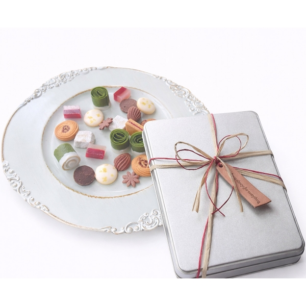 抹茶のラングドシャ4個、カカオディアマン2枚、カカオポッシュ2枚、カカオのお花クッキー2枚、バニラのフロランタン6枚、ベルガモットアイシングクッキー6枚、スパイスクッキーフランボワーズジャムサンド6枚、ネージュクッキー6枚、ライチとフランボワーズのパートドフリュイ3個