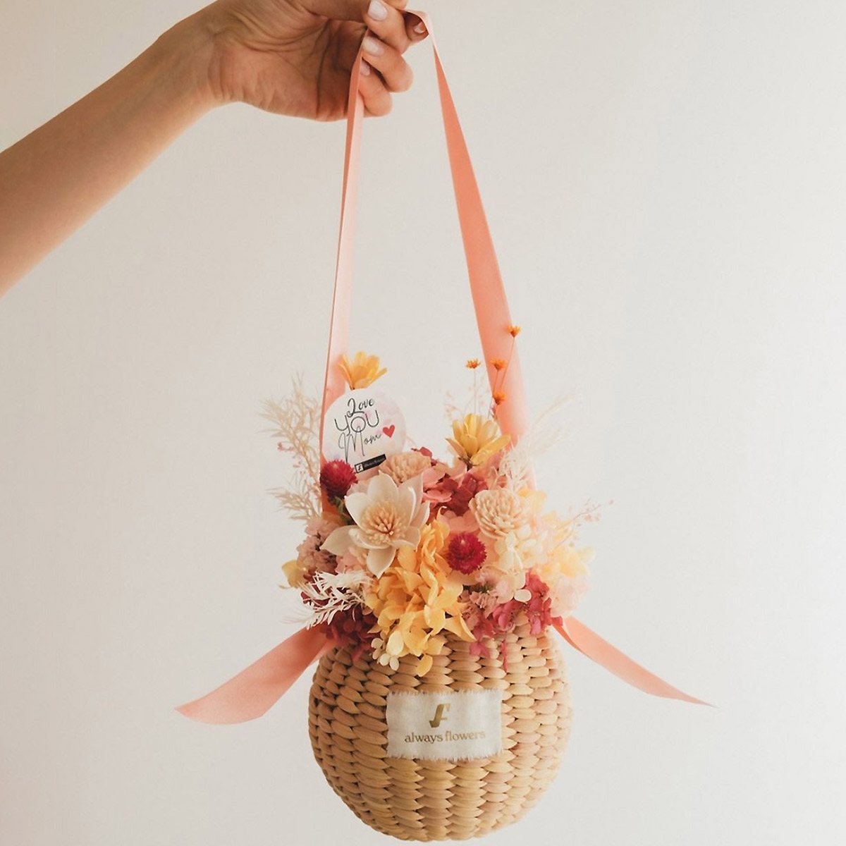 「カゴバッグフラワー」の母の日限定デザインが登場。愛らしいまん丸のカゴに丁寧にお花をあしらいます。『LoveyouMom』のタグ付きで、気持ちを伝えられます。【カゴバッグフラワーとは】バッグのように持ち歩ける遊びゴコロたっぷりのフラワーアイテム。お家では、置いたり、壁掛けにして飾ったり様々な楽しみ方が出来る優秀アイテム。ひとつひとつ手作りのカンボジア製のカゴはまん丸フォルムが魅力的。デザイナーチョイスの花々をふんだんにあしらいました。ドライフラワーとプリザーブドフラワーを使っているので長くお花を楽しめます。